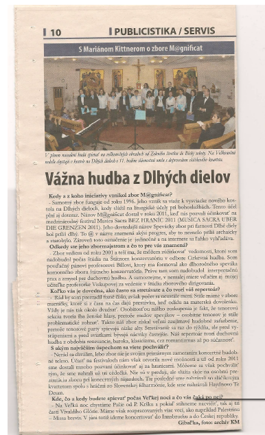 • Zbor M@gnificat bude účinkovať na BHS 1.10.2013 v Slovenskej filharmónii, ako súčasť Zboru Consortium Bratislava, ktorý je zložený zo študentov Štátneho konzervatória a zboru M@gnificat. Zbor bude premierovať dielo Norberta Bodnára – DEVÍNSKE BRALO.  Listky sa stále dajú kúpiť, hoci je ich uz málo: